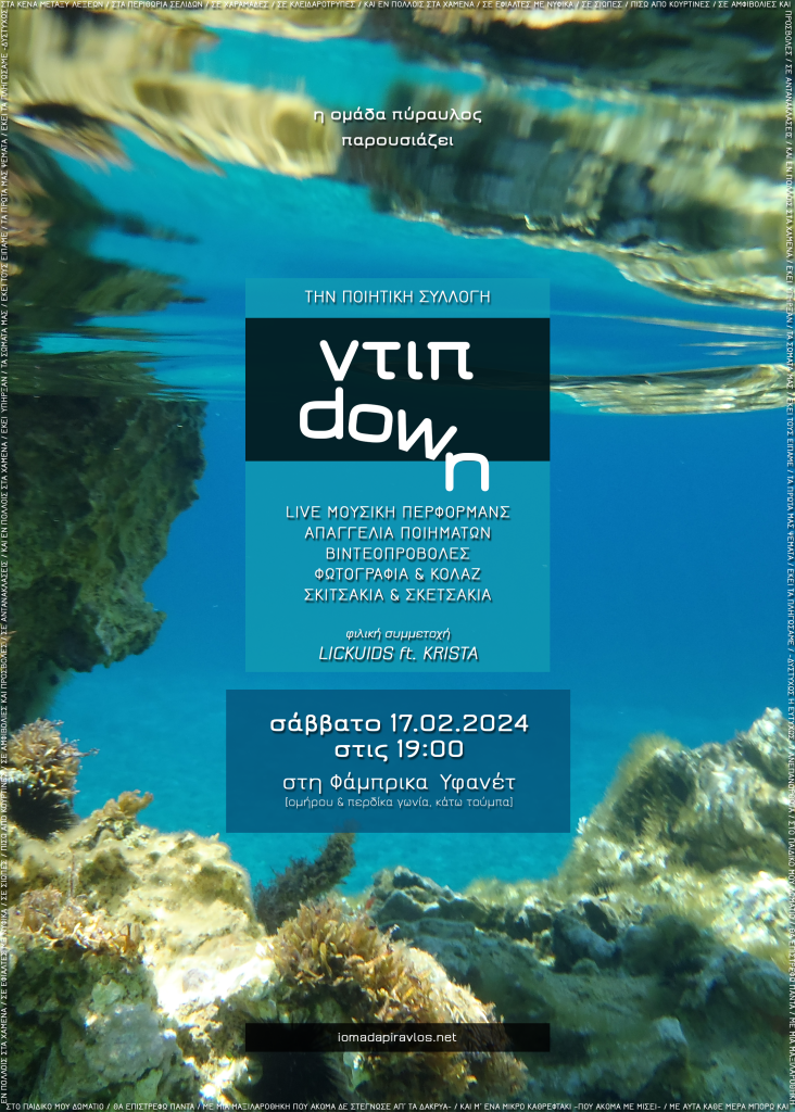 * την ημέρα της εκδήλωσης θα μπορείτε να προμηθευτείτε αντίτυπα του ντιπdown, που διατίθεται με ελεύθερη οικονομική συνεισφορά, για να το προσθέσετε στη συλλογή σας και για να στηρίξετε το αυτοεκδοτικό μας εγχείρημα.